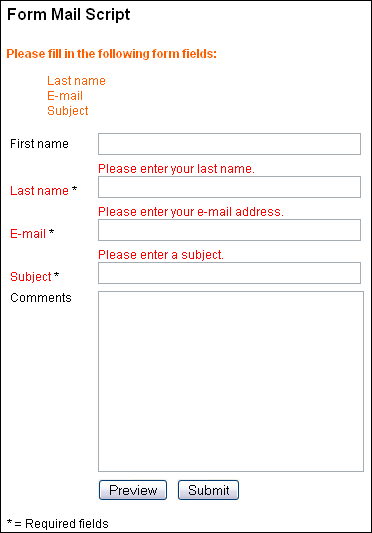 Every form field can be marked as a mandatory field. This means that the form will not be submitted until these fields are filled in. Enter all the field names you want to be mandatory, in a hidden form field in the template. For example:
